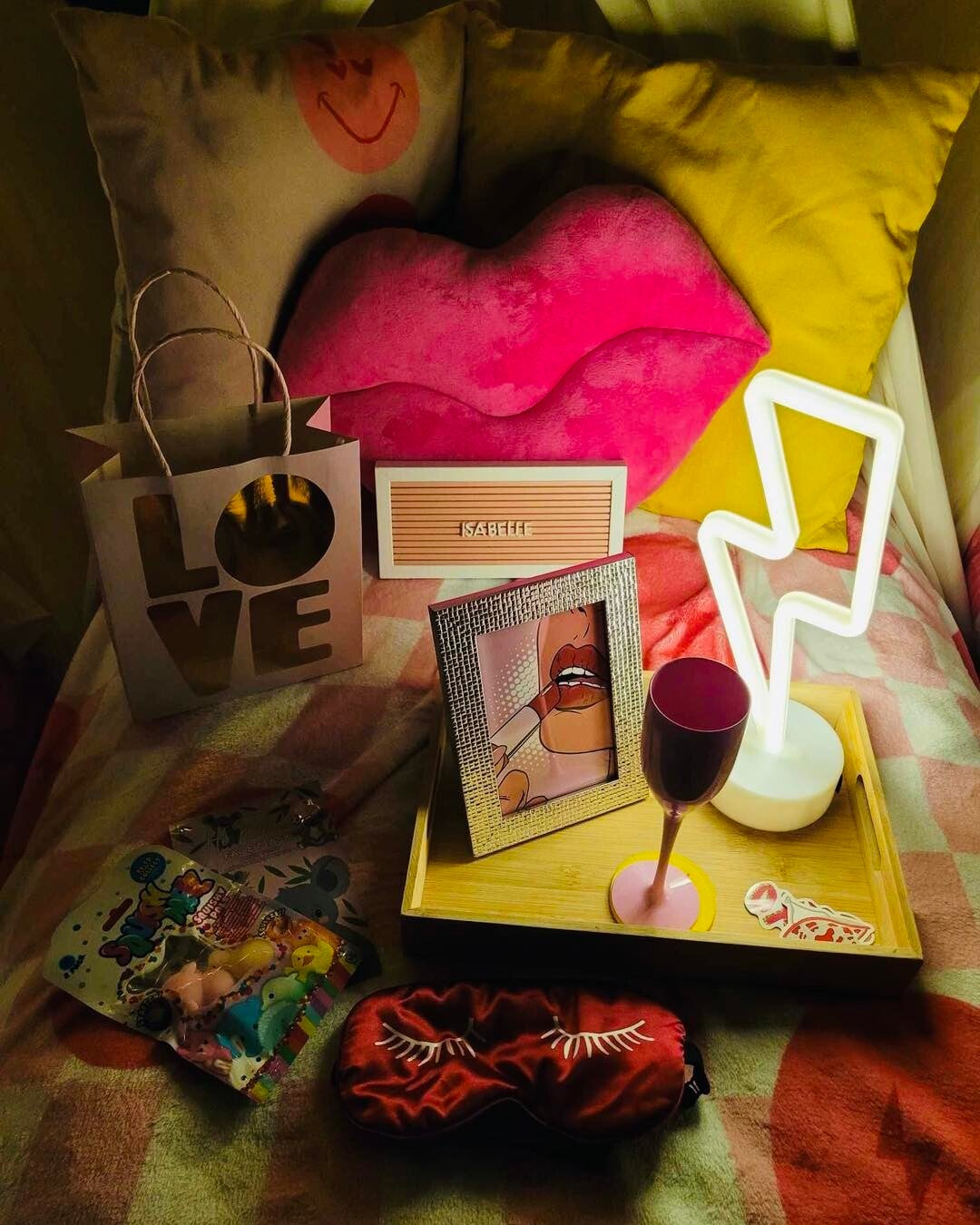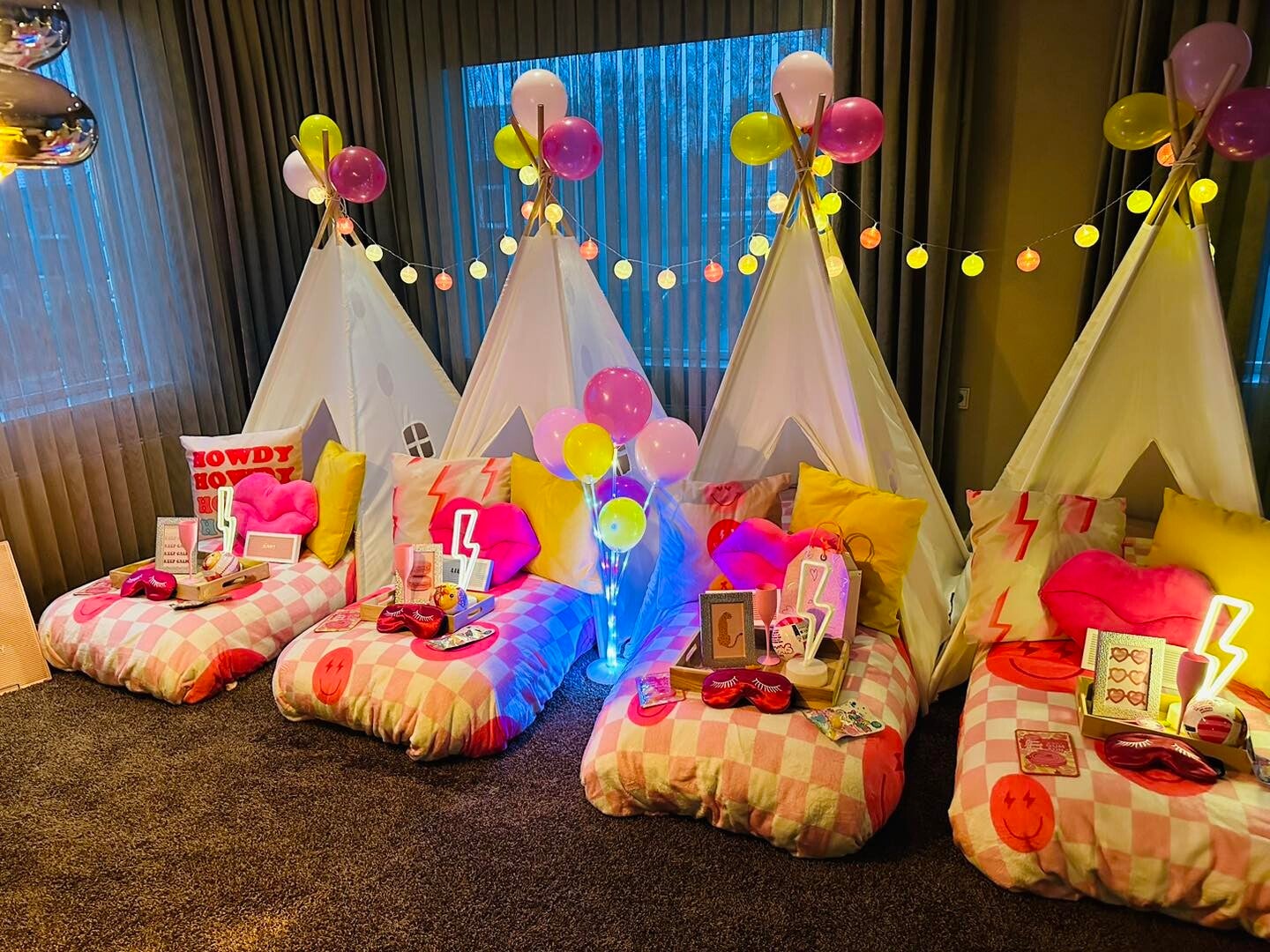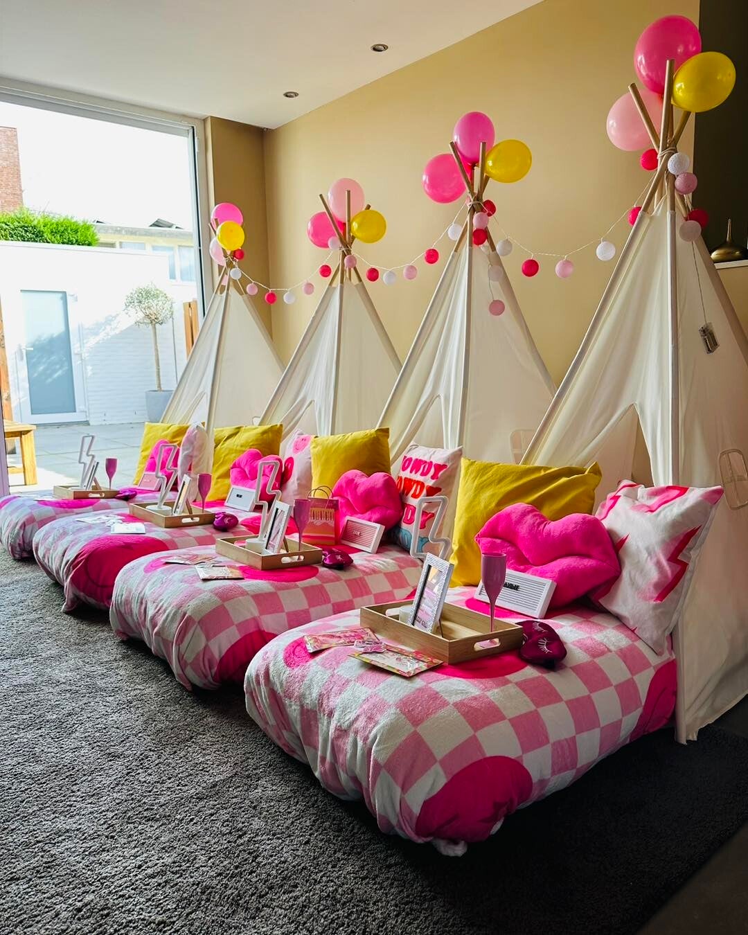 Ons Big Kisses thema is één groot knuffelmoment in droomvorm. Denk aan knusse tippie tentjes, omringd door grote, zachte lippenkussens in warme roze tinten — alsof elke hoek een kusje fluistert.