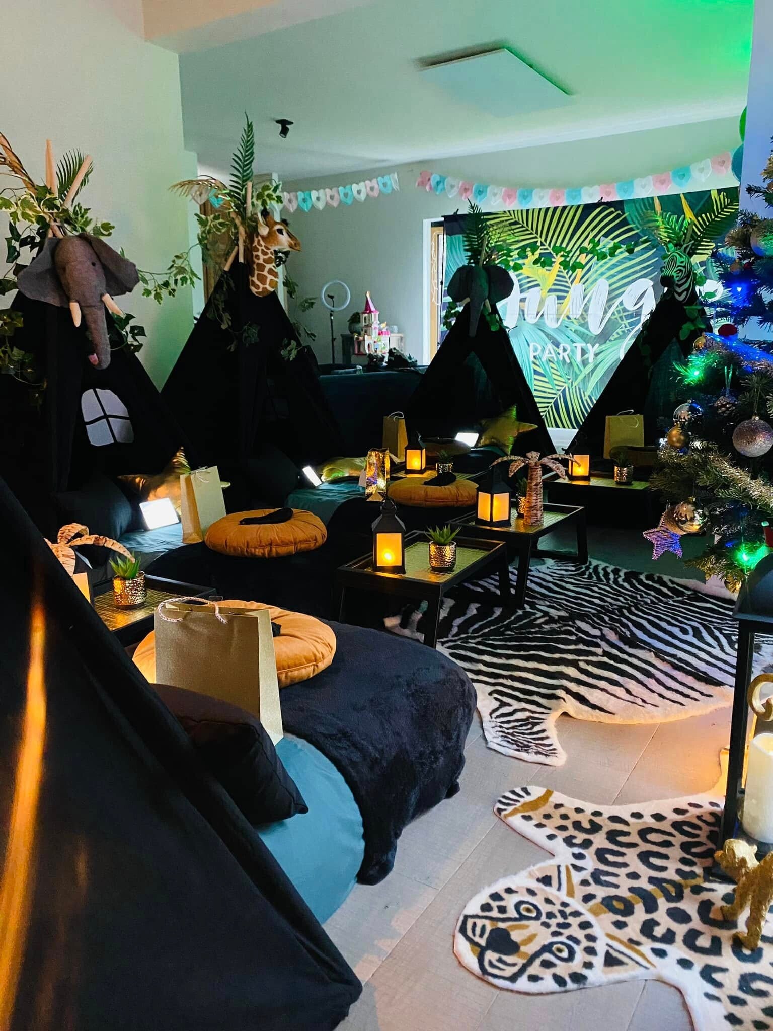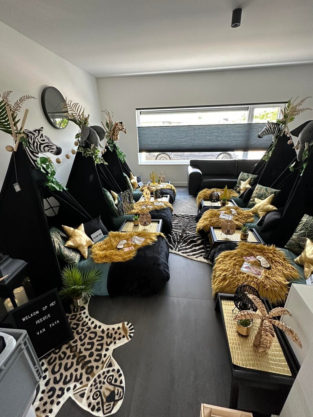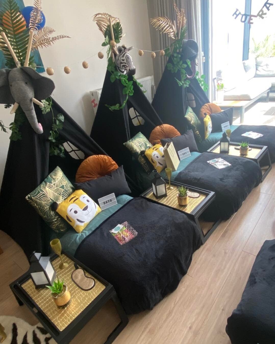 Ons Jungle thema tovert elk slaapfeestje om tot een speelse ontdekkingstocht. De tippie tentjes worden kleine kampjes diep in het groen, omringd door bladeren, dierenprints en warme aardetinten die je meenemen naar een verborgen paradijs.