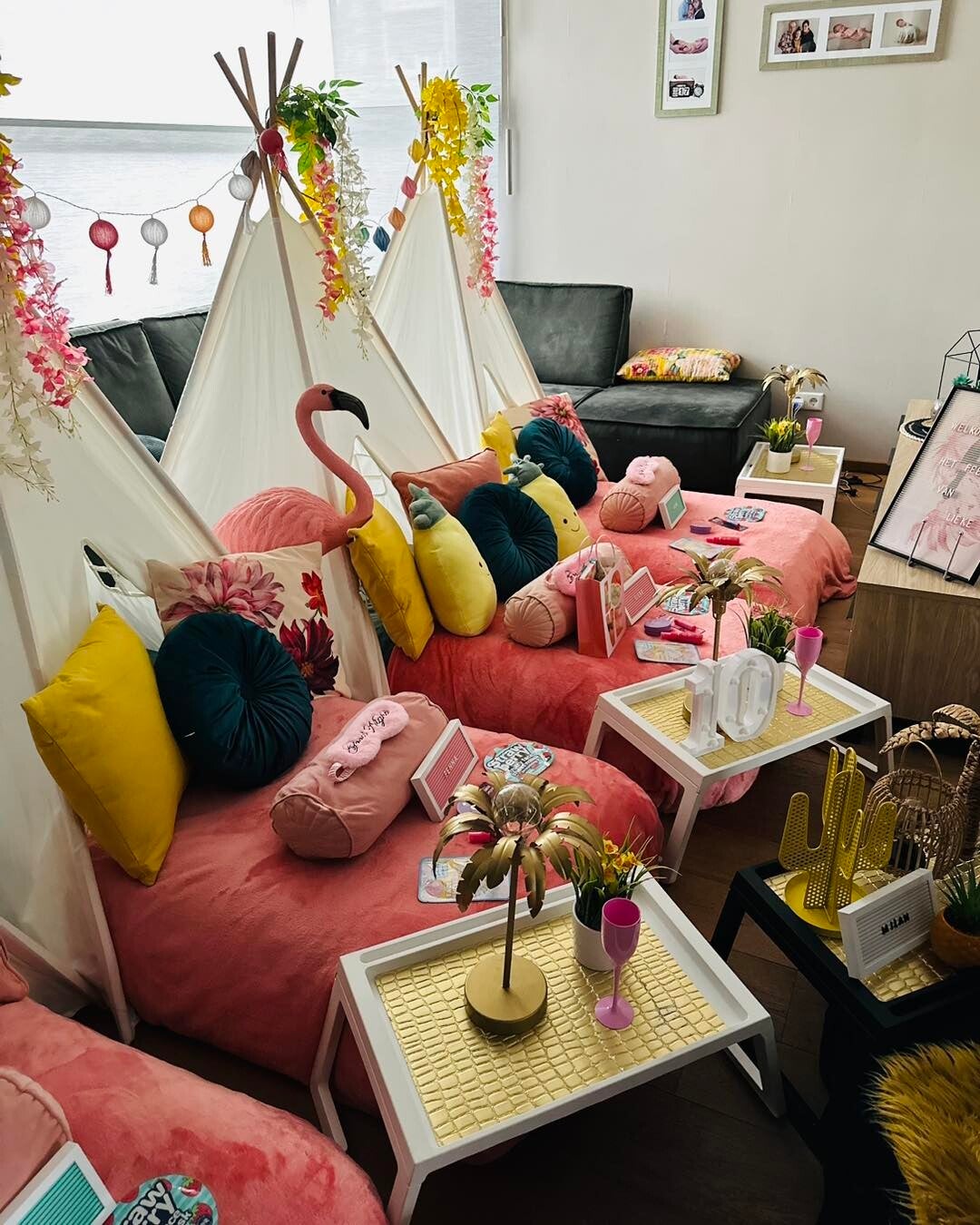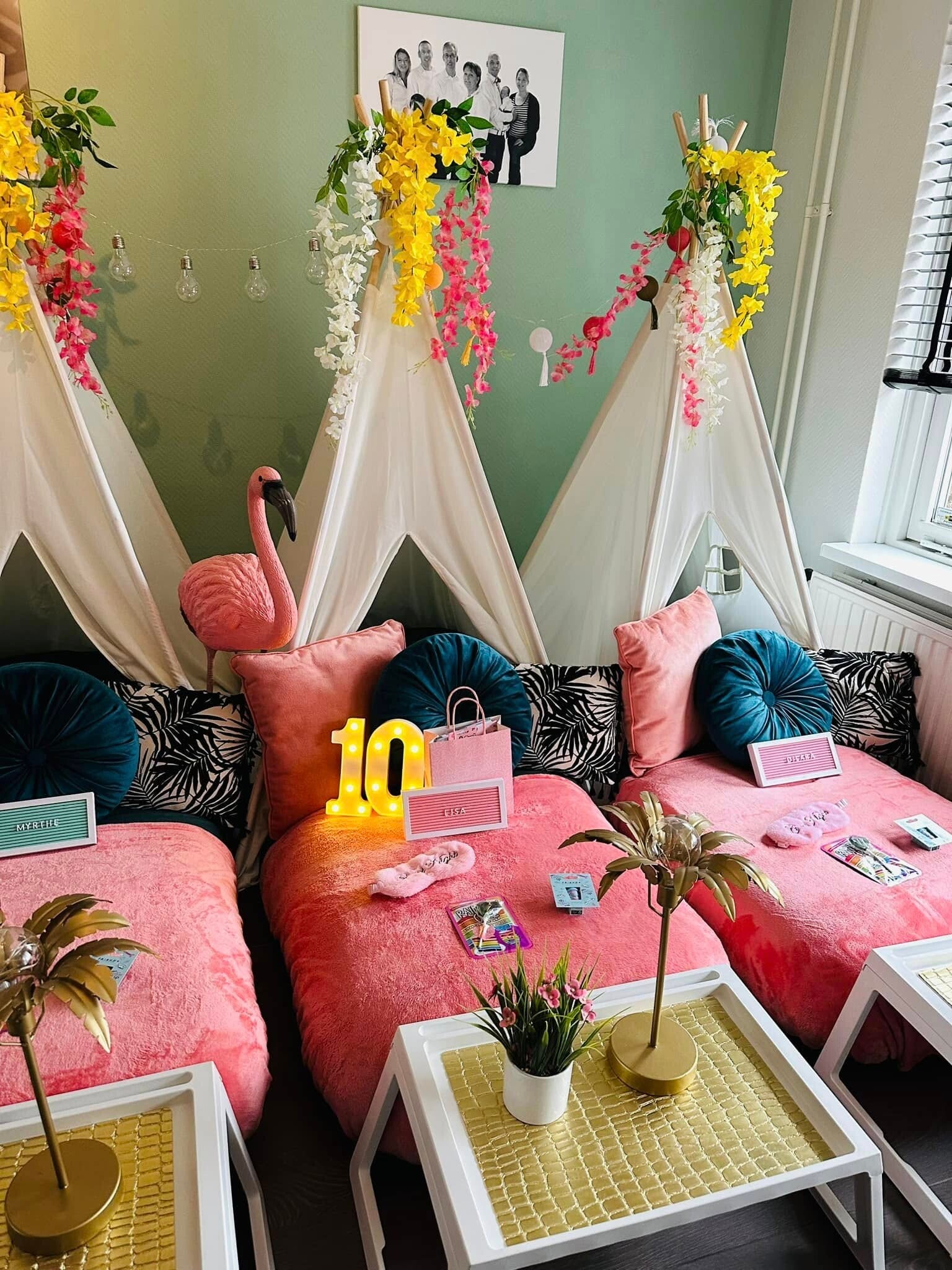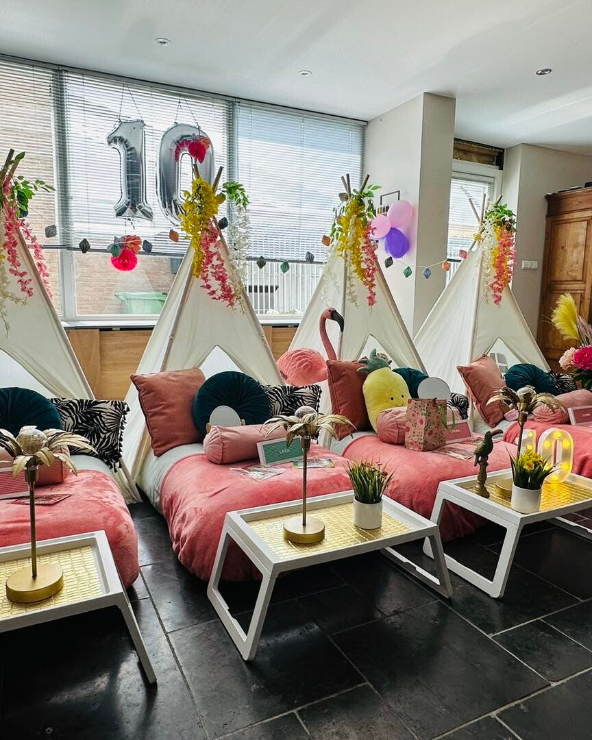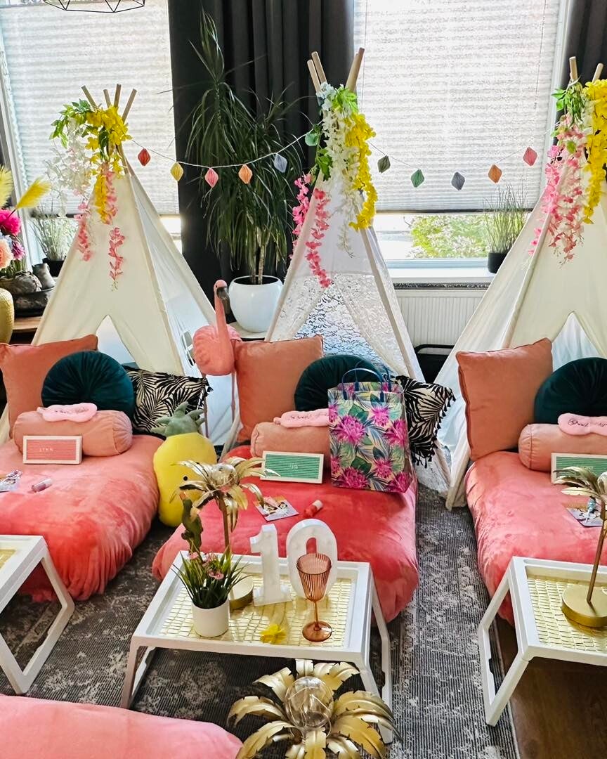 Ons Ohana thema brengt een tropisch droomfeestje tot leven, vol speelse flamingo’s, vrolijke ananassen en zachte, zomerse kleuren die je meteen meenemen naar een paradijselijk eiland. De tippie tentjes worden kleine strandhutjes, waar elke dromer haar eigen plekje vindt onder een hemel vol zachte lichtjes.