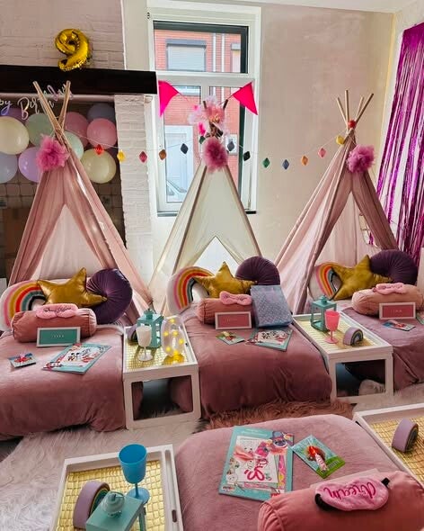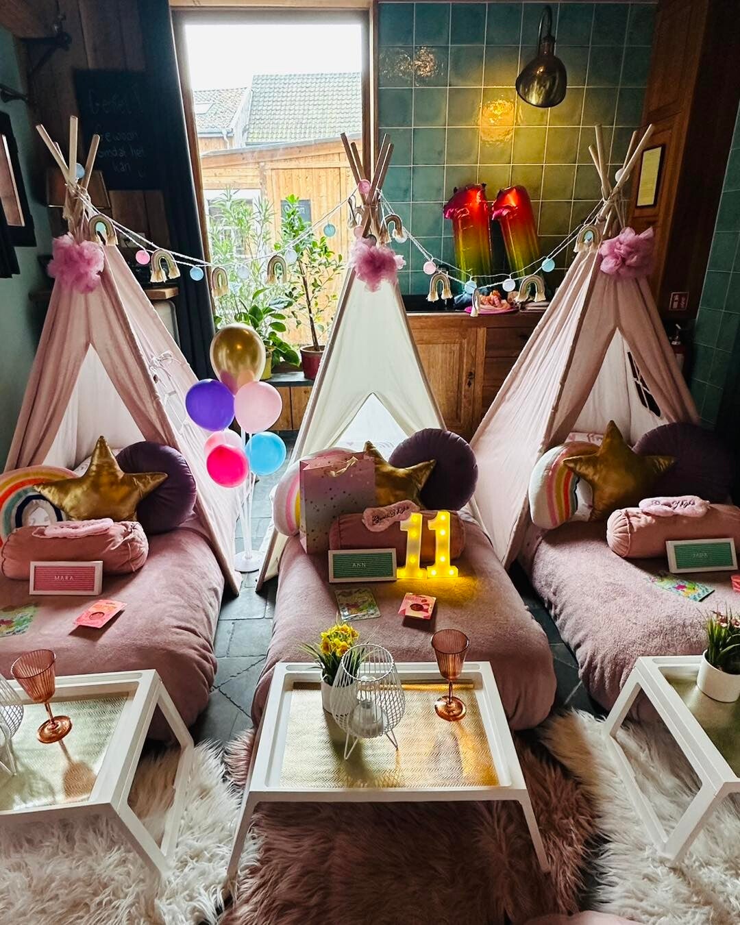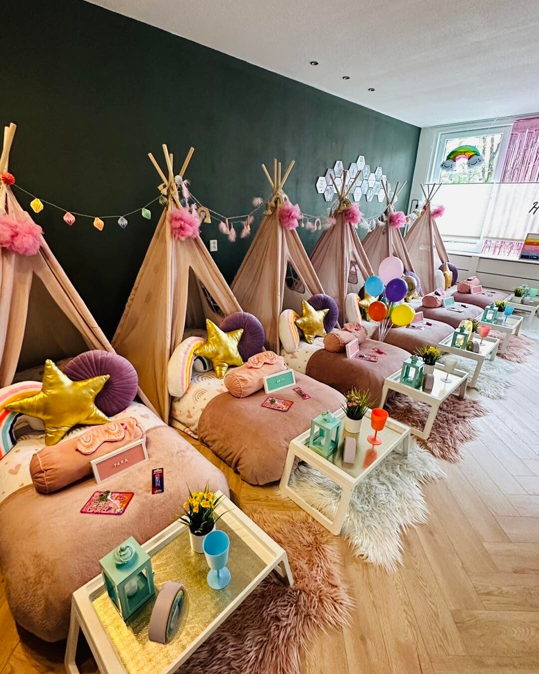 Ons Rainbow thema brengt een speels en vrolijk slaapfeestje tot leven, gevuld met zachte kleuren, sprankelende accenten en een warme gloed die meteen een glimlach op elk gezicht tovert. De tippie tentjes worden kleine regenbooghuisjes, waar elke dromer haar eigen kleurrijke plekje krijgt.