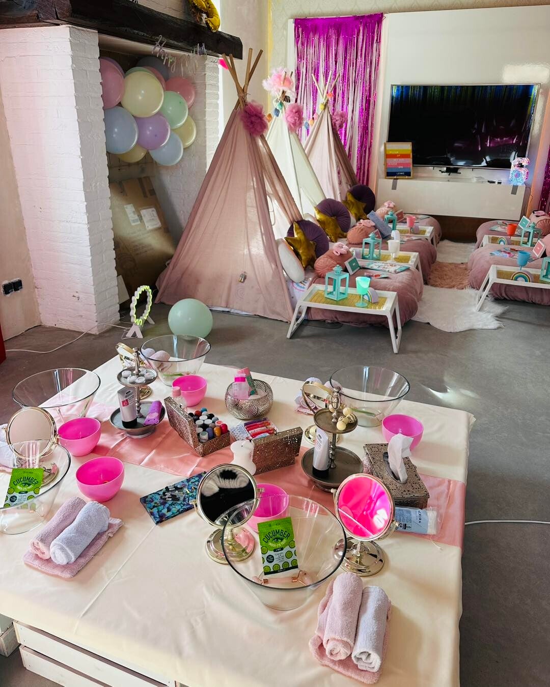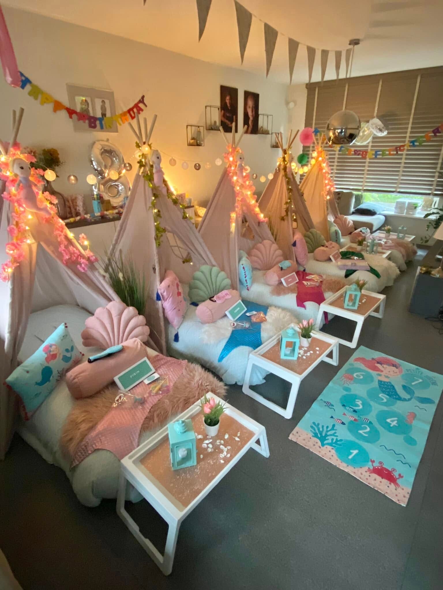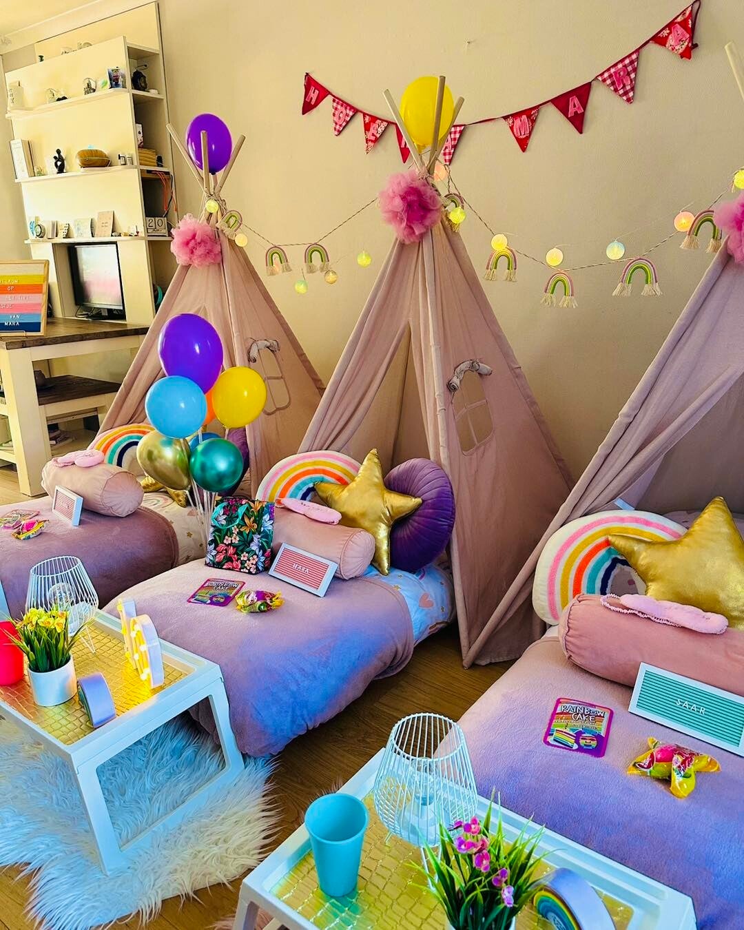 Ons Rainbow thema brengt een speels en vrolijk slaapfeestje tot leven, gevuld met zachte kleuren, sprankelende accenten en een warme gloed die meteen een glimlach op elk gezicht tovert. De tippie tentjes worden kleine regenbooghuisjes, waar elke dromer haar eigen kleurrijke plekje krijgt.